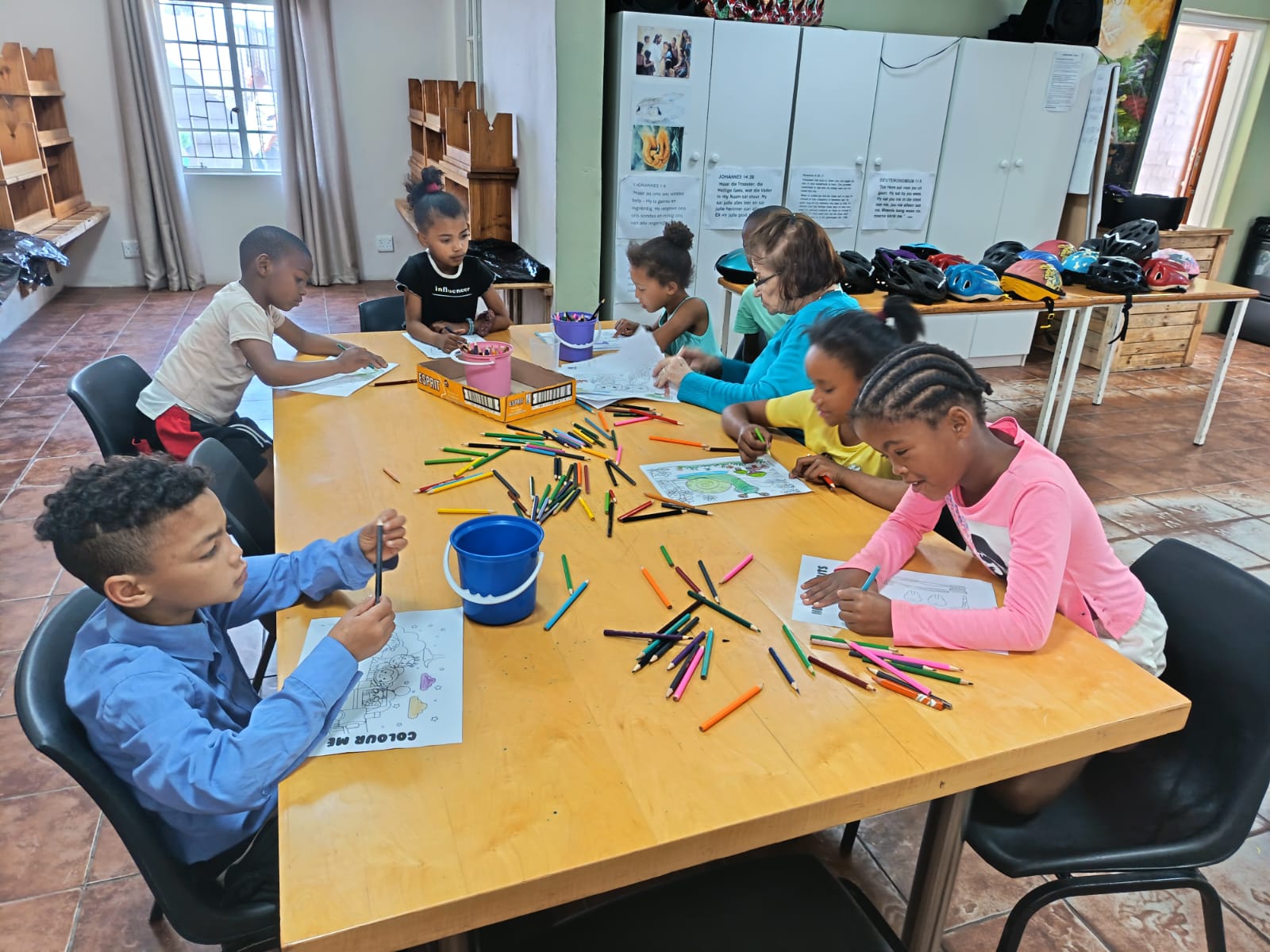 There is an opportunity for children who cannot ride bicycles as well as the children who are tired of riding to sit and color pictures until the project ends.